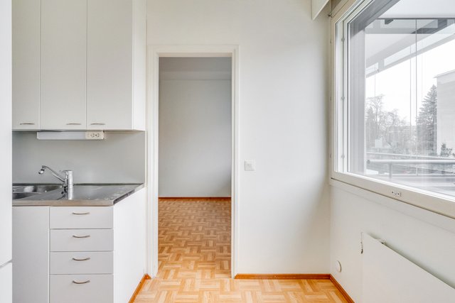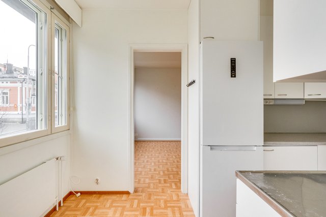 Kodikkaaseen erilliseen keittiöön tultaessa katse kiinnittyy ikkunaan, jonka eteen mahtuu pieni ruokapöytä, sen ääressä voit nauttia kulinaristisista hetkistä tai juoda aamukahvit ja myöhemmin iltateen, seuraten kaunista kaupunkimaisemaa omassa rauhassa. Keittiö on oikea tilaihme, tänne on saatu mahtumaan myös kompaktit keittiölaitteet. Säilytys sekä laskutilaa on hyvin.