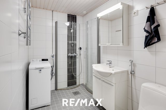 - WC-istuin, suihku, suihkuseinä, pesukoneliitäntä, peilikaappi, allaskaappi, pyyhekuivain, ja lattialämmitys