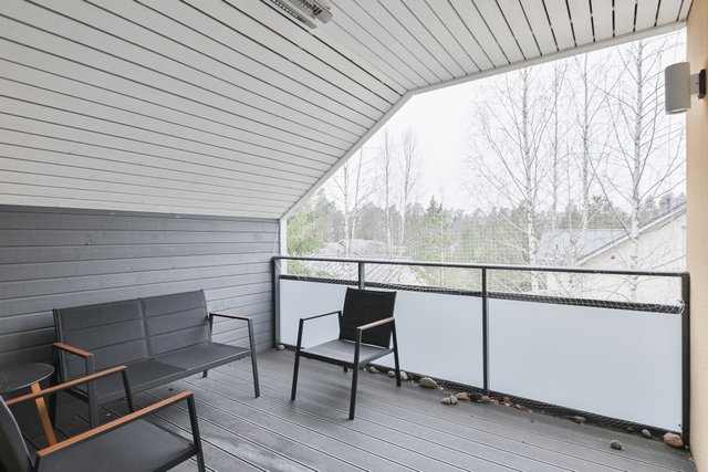 Kolme makuuhuonetta tarjoavat tilaa perheelle tai vieraille, ja lisäksi talossa on erillinen kodinhoitohuone omalla sisäänkäynnillä, mikä helpottaa arjen askareita. Kylpyhuoneet ja sauna tarjoavat rentoutumismahdollisuuksia, ja niiden lattialämmitys tuo lisämukavuutta. Yläkerran parveke ja etupihan terassi kutsuvat nauttimaan ulkoilmasta.