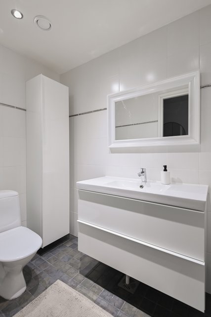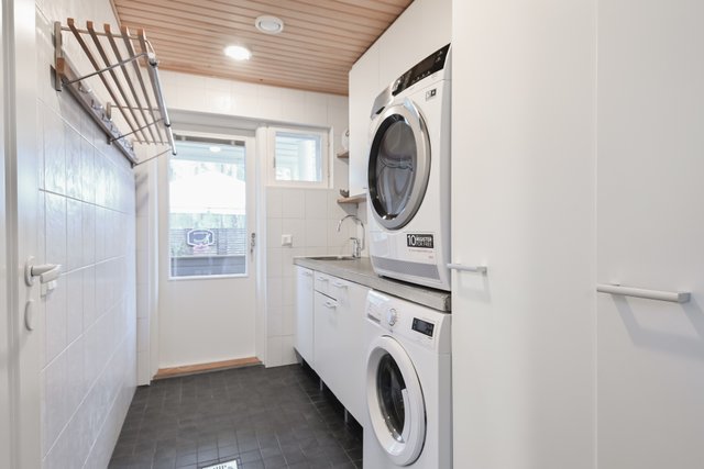 - Pesukoneliitäntä, lattialämmitys, lattiakaivo, pyykkikaapit, pöytätaso, ja tila pesutornille