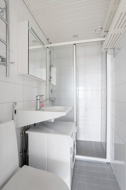 - WC-istuin, suihku, suihkuseinä, lattialämmitys, pesukoneliitäntä, ja peilikaappi