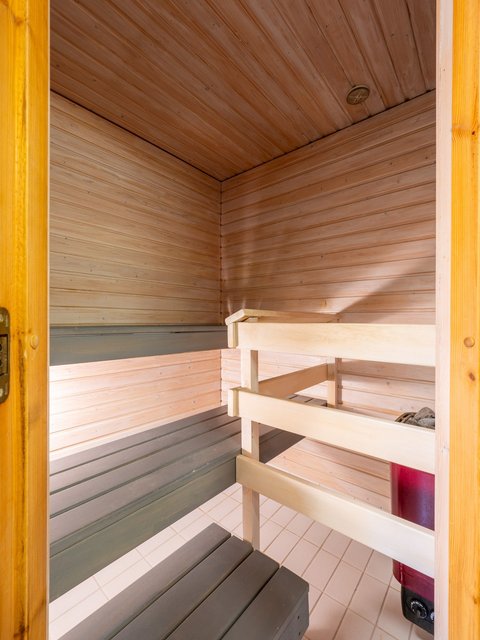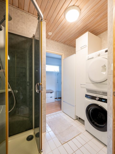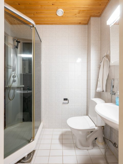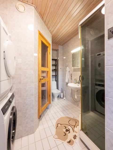 - WC-istuin, suihku, suihkukaappi, pesukoneliitäntä, lattialämmitys, peilikaappi, pesuallas, ja bidee-suihku
