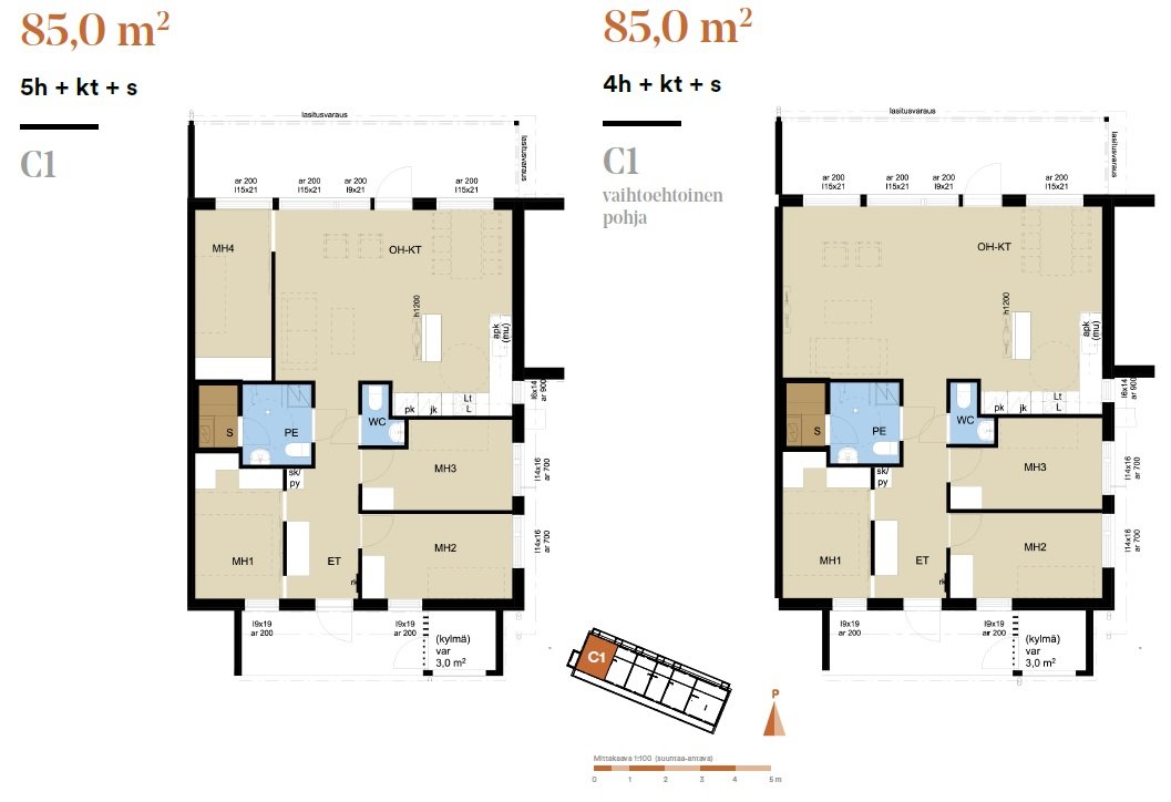 - ET, OH, KT, MH ja VH: vinyyli. PE, sauna, WC ja KHH: laatoitettu.