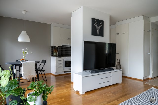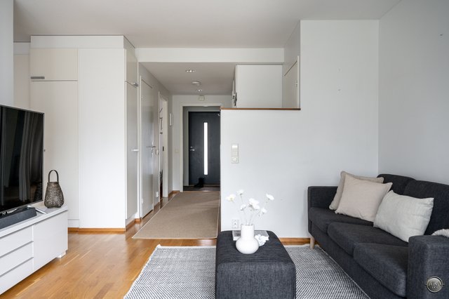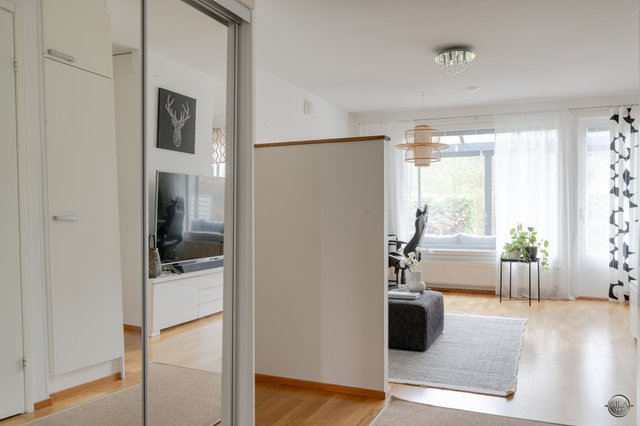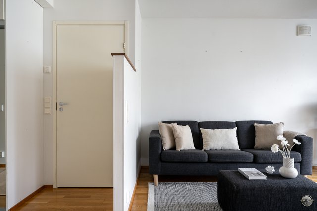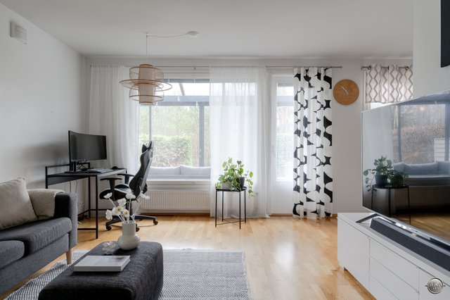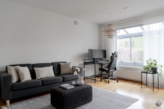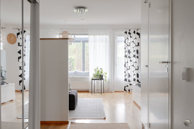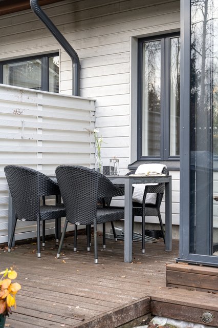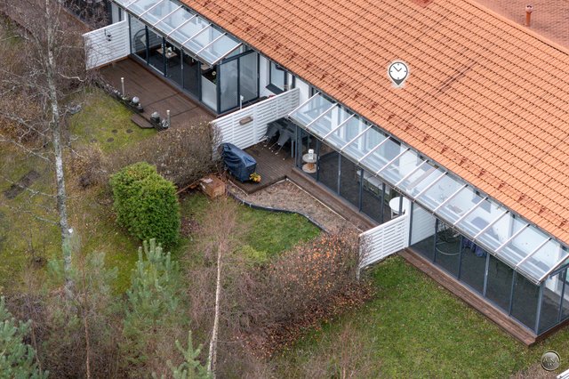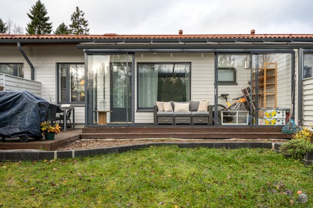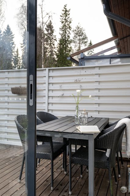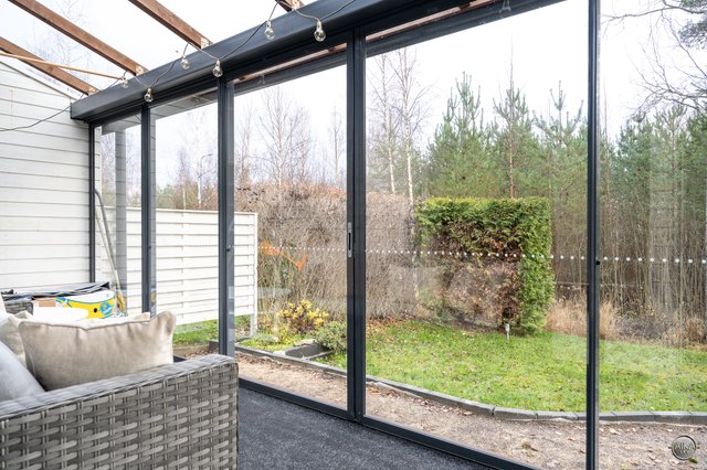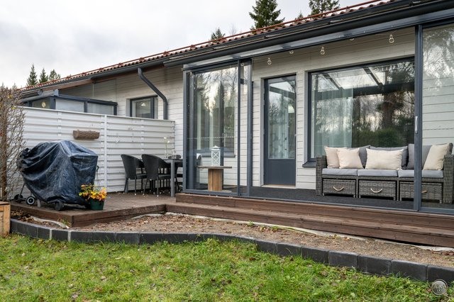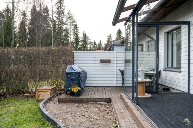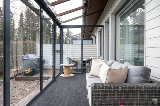 Asunnon suojaisa, aidattu piha-alue rajoittuu kauniiseen puistometsään, mikä luo ihanteelliset puitteet rentoutumiselle ilman naapurien katseita. Lasitetulla terassilla voit nauttia aamukahvista tai illallisesta ympäri vuoden. Sisätiloissa on käytetty laadukkaita ja nykyaikaisia materiaaleja.