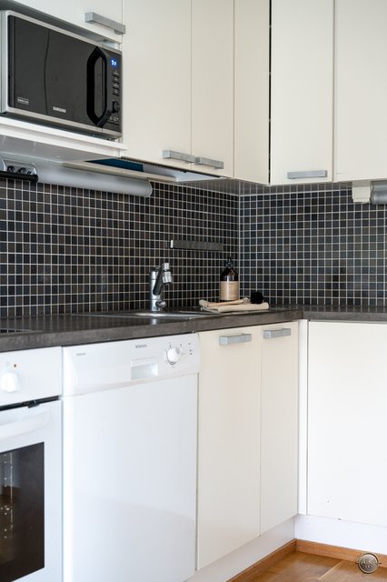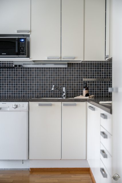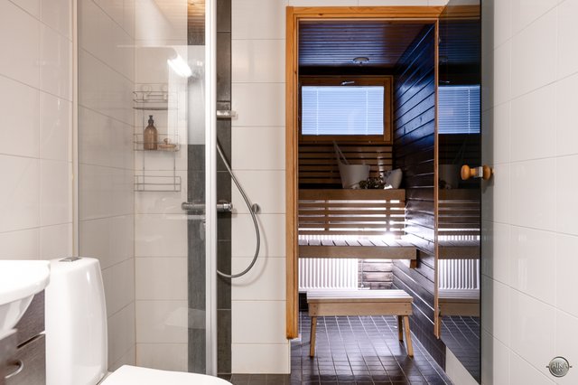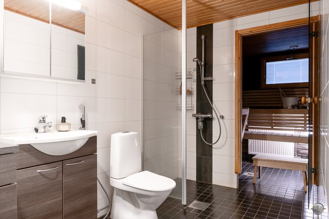 - WC-istuin, suihku, suihkuseinä, pesukoneliitäntä, lattialämmitys, peilikaappi, allaskaappi, ja kodinhoitokaapistot