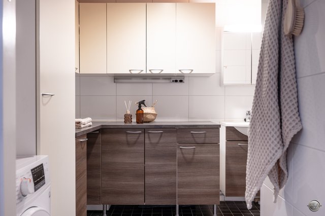 - Kylpyhuoneen yhteydessä kodinhoitotilat, joissa todella reilusti kaappi ja laskutilaa.