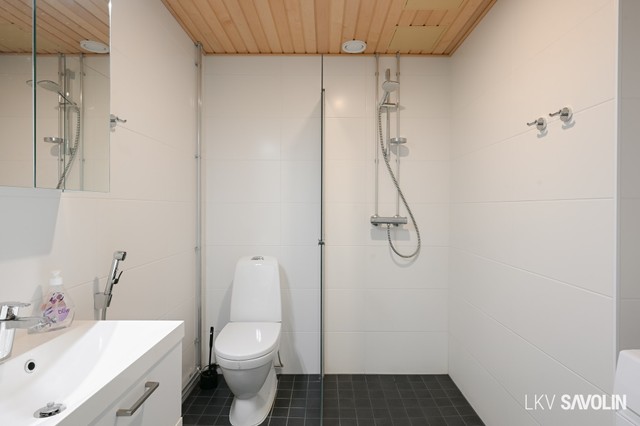 - WC-istuin, suihku, suihkuseinä, pesukoneliitäntä, lattialämmitys, peilikaappi, pesuallas, allaskaappi, ja bidee-suihku