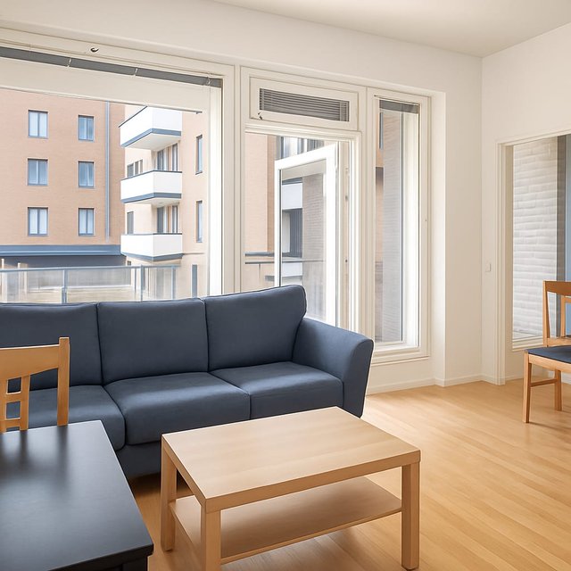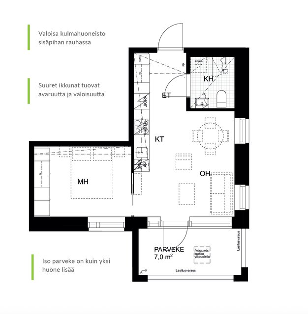 Asunnon pohjaratkaisu on selkeä ja käytännöllinen. Avoin keittiö ja olohuone muodostavat yhtenäisen, helposti sisustettavan kokonaisuuden. Makuuhuone tarjoaa oman rauhan ja säilytystilaa löytyy hyvin. Lasitettu parveke toimii mukavana lisätilana aikaisesta keväästä pitkälle syksyyn.