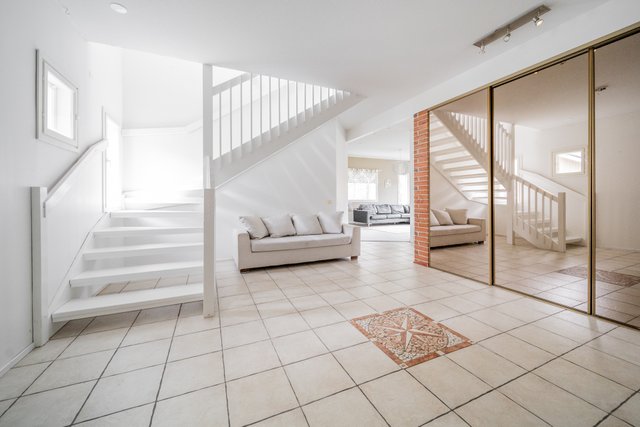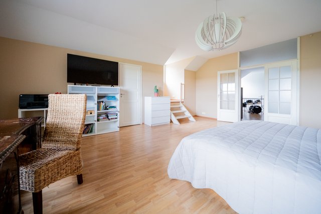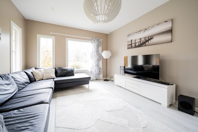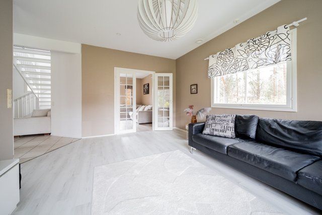 - Helposti kalustettava tila. Lasipariovet johtavat toiseen alakerran makuuhuoneista.