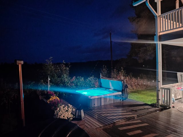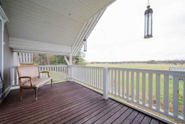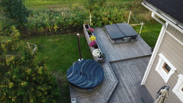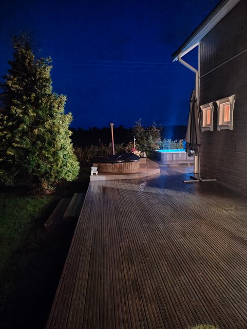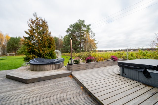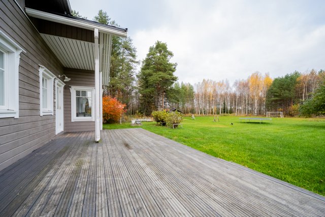 - Terassi kiertää talon aurinkoisen sivun ympäri. Laajennus ulkoporealtaalle on tehty vuonna 2022.