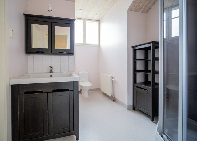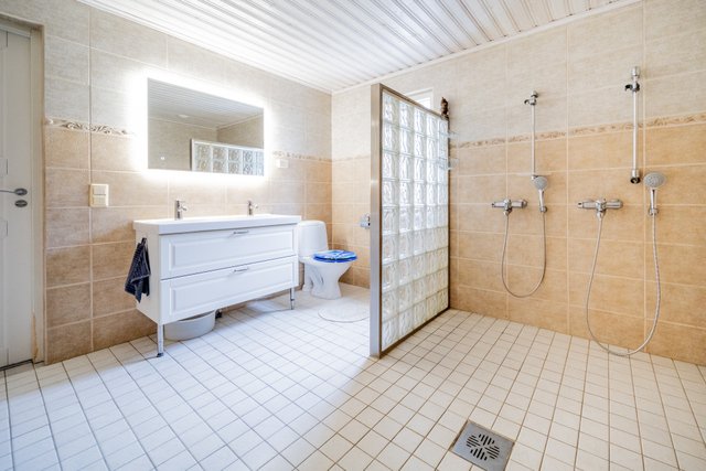 - Siistit kaakeloinnit ja kalusteet. Kaksi suihkua ja wc-istuin sekä pesuallas. Ikkunat antavat luonnonvaloa.