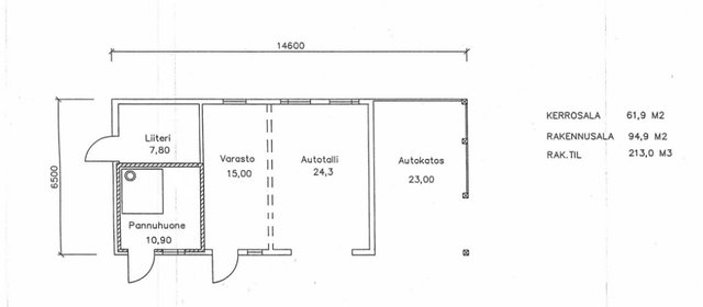 - Autotalli/katosrakennuksen yhteydessä liiteri ja lämmönjakohuone. Autotallin yhteyteen piirretylle varastolle ei ole rakennettu väliseinää.