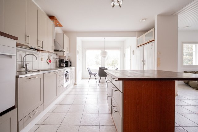 - Mukavasti työtasoa ja kaappitilaa. Kodinkoneistuksen lisäksi leiviuuni, jonka edustalla saareke ja laskutilaa. Ikkunan edessä on hyvä tila ruokailuryhmälle.