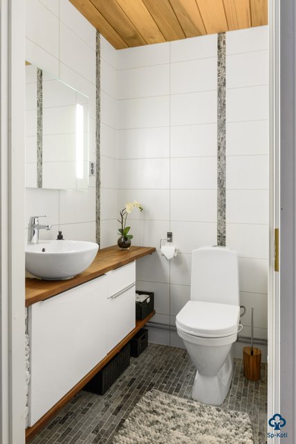 - WC-istuin, suihku, suihkuseinä, pesukoneliitäntä, lattialämmitys, peili, allaskaappi, ja pyyhekuivain