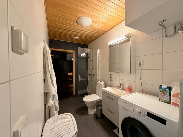 - WC-istuin, suihku, suihkuseinä, pesukoneliitäntä, lattialämmitys, peilikaappi, pesuallas, allaskaappi, ja bidee-suihku