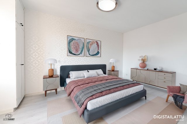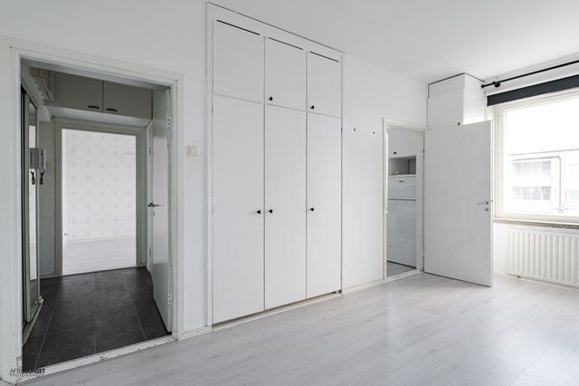 Makuuhuoneessa kiinteät kaapit vaatesäilytykseen.