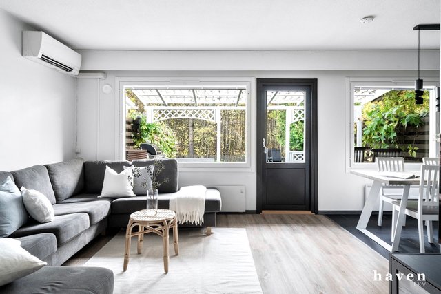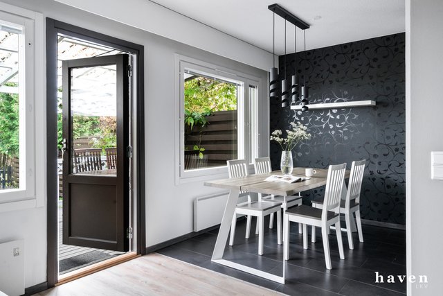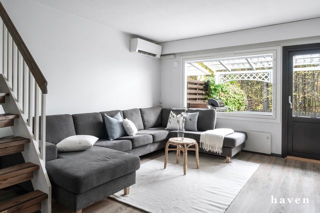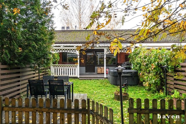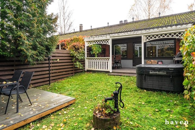 Lämminhenkinen asunto hurmaa tunnelmallaan ja kauniilla sävymaailmallaan. Pohjaratkaisu on toimiva ja käytännöllinen. Asuintilat ovat yhdessä tasossa ja lisäksi iso, asuinkäyttöön muutettu käyttöullakko, josta on saatu yksi lisähuone. Keittiö, kylpyhuone ja sauna sekä lattiat ja pinnat remontoitu / uusittu 2009-2010. Olohuoneesta käynti koko asunnon levyiselle katetulle terassille ja kokonaan aidatulle takapihalle, jossa oma poreamme. Tilava makuuhuone, jonka yhteydessä vaatehuone. Lisäsäilytystilaa tarjoaa kaapistot, lapetilat ja lämmin varasto.