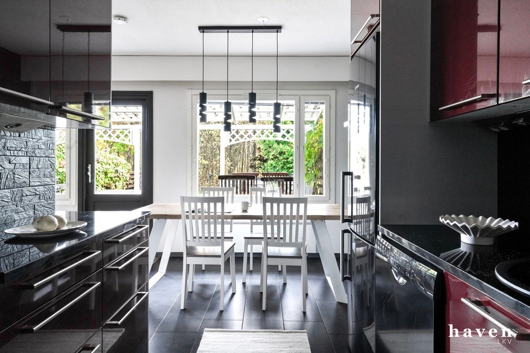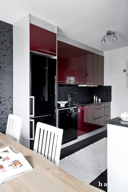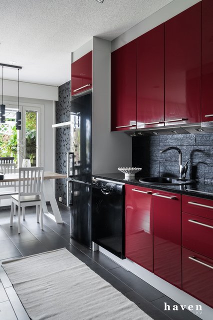 - Jääkaappi/pakastin, keraaminen keittotaso, erillisuuni, integroitu mikroaaltouuni, liesituuletin (hormi), astianpesukone. Tyylikäs, vuonna 2010 remontoitu keittiö. Kivitasot, mustat kodinkoneet (Bosch), burgundinpunaiset kaapinovet. Keittiön runko on valkoinen ja välitila kivilaattaa. Laattalattia (2010).