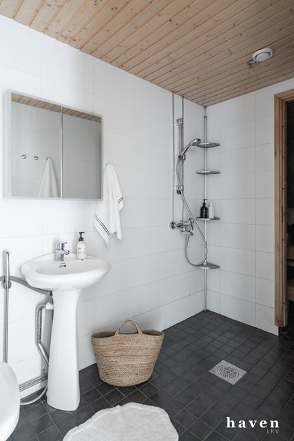 - Tilava laatoitettu kylpyhuone lattialämmityksellä. Peilikaappi, pesukoneliitäntä ja oma tila pesutornille. Remontoitu 2009.