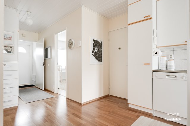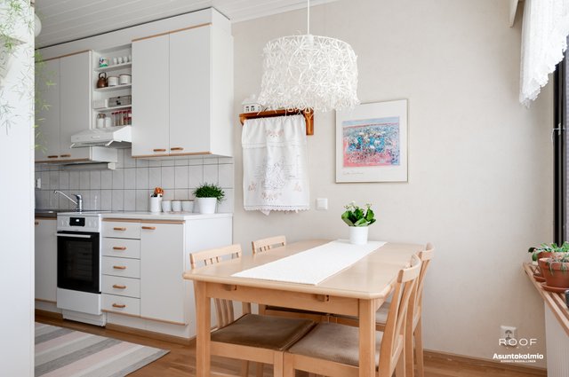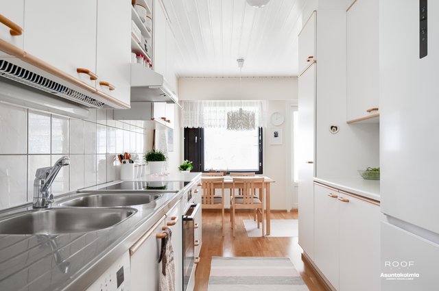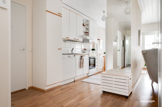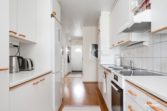 - Jääkaappipakastin (uusittu 2020), liesi (uusittu 2022), liesituuletin (uusittu 2022), ja astianpesukone