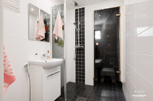 - Suihku, suihkuseinä, peili, pesuallas, allaskaappi, ja lattialämmitys