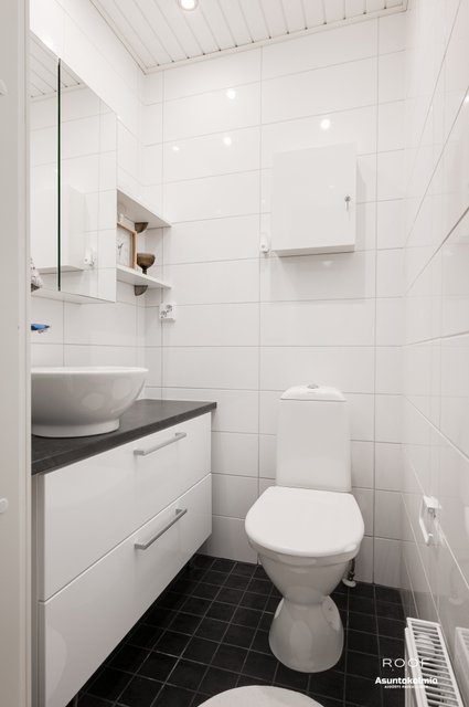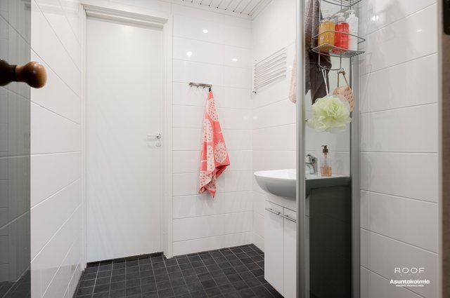 - Pesukoneliitäntä, lattialämmitys, pyykkikaapit, pöytätaso, ja lattiakaivo
