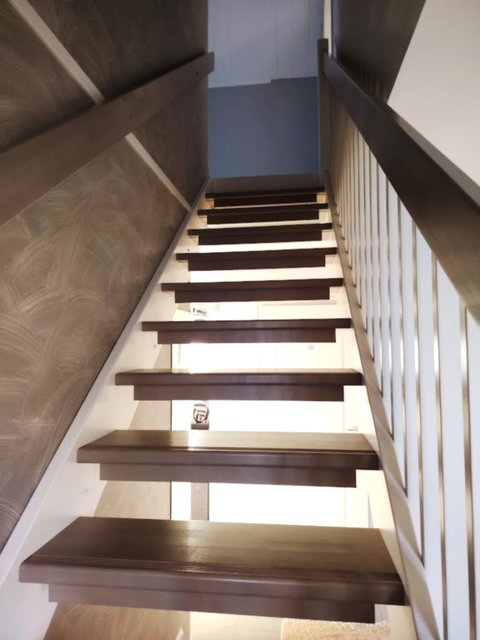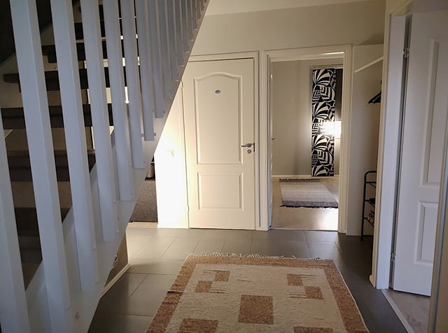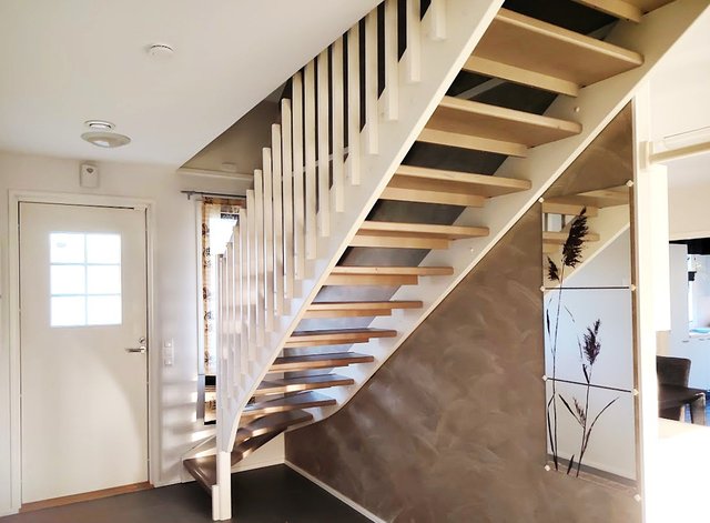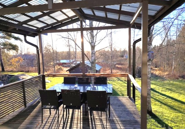 - On huomioitava, että yläkerran parvekkeen kaiteet, osa listoista ja terassin kaiteiden asennus on kesken.