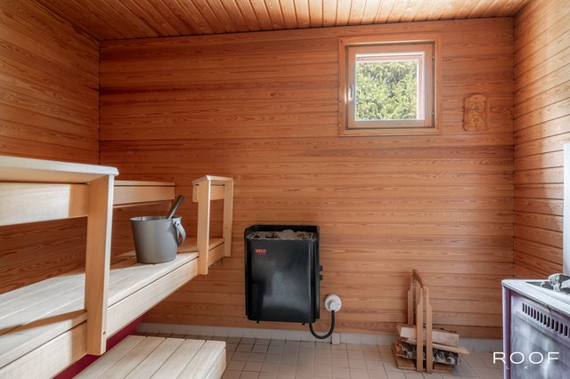 - Varustus: Sähkökiuas, puukiuas. Seinät: Puu. Lattia: Laatta.