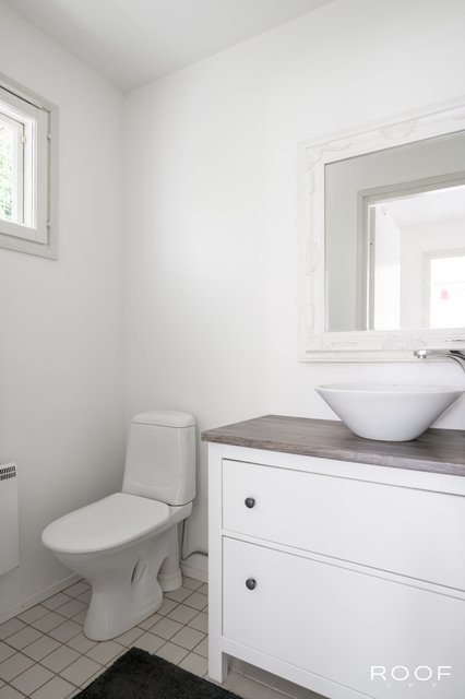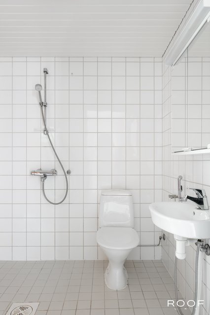 - Varustus: Wc-istuin, suihku, pesukoneliitäntä, lattialämmitys, peilikaappi. Seinät: Kaakeli. Lattia: Laatta.