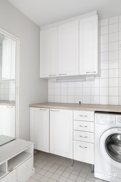 - Varustus: Pesukoneliitäntä, lattialämmitys, lattiakaivo. Seinät: Kaali / Maalattu. Lattia: Laatta.