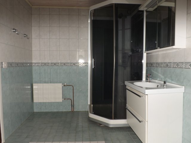 - Suihku, pesukoneliitäntä, peili, pesuallas, allaskaappi, ja suihkukaappi
