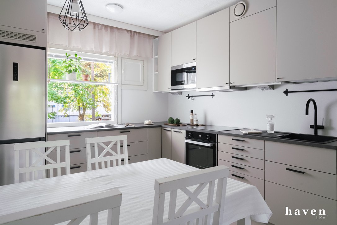 - Jääkaappi/pakastin, induktiokeittotaso, erillisuuni (kiertoilma, pyrolyysi), mikroaaltouuni grillitoiminnolla, liesituuletin (aktiivihiili), astianpesukone. Paljon kaappi- ja laskutilaa. Kaunis hiekansävyinen keittiö, remontoitu 2024.