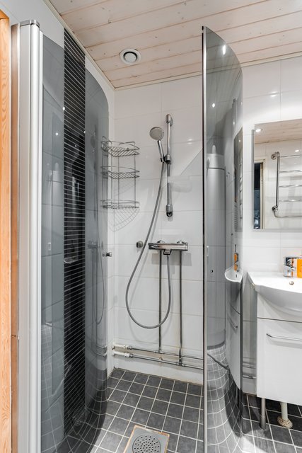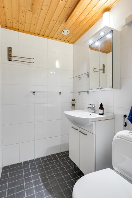 - Suihku, suihkuseinä, pesukoneliitäntä, peili, pesuallas, allaskaappi, kuivauskaappi, ja kuivauspatteri
