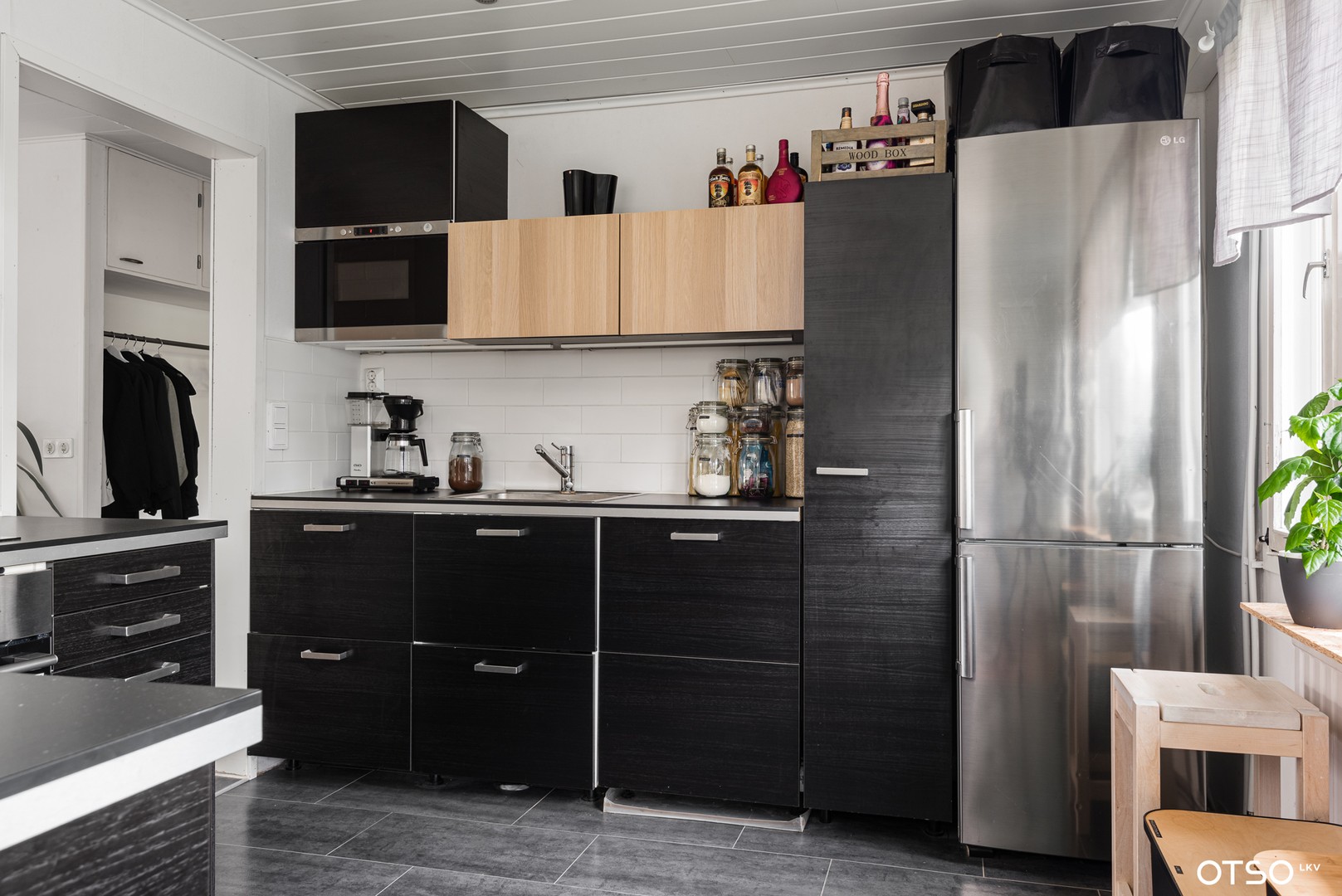 Paljon hyviä remontteja läpikäynyt kolmen makuuhuoneen koti. Upea musta keittiö avautuu saarekkeen kautta ruokailutilaan ja tila jatkuu olohuoneeseen luoden kutsuvan kokonaisuuden. Isot ikkunat tuova valoa.