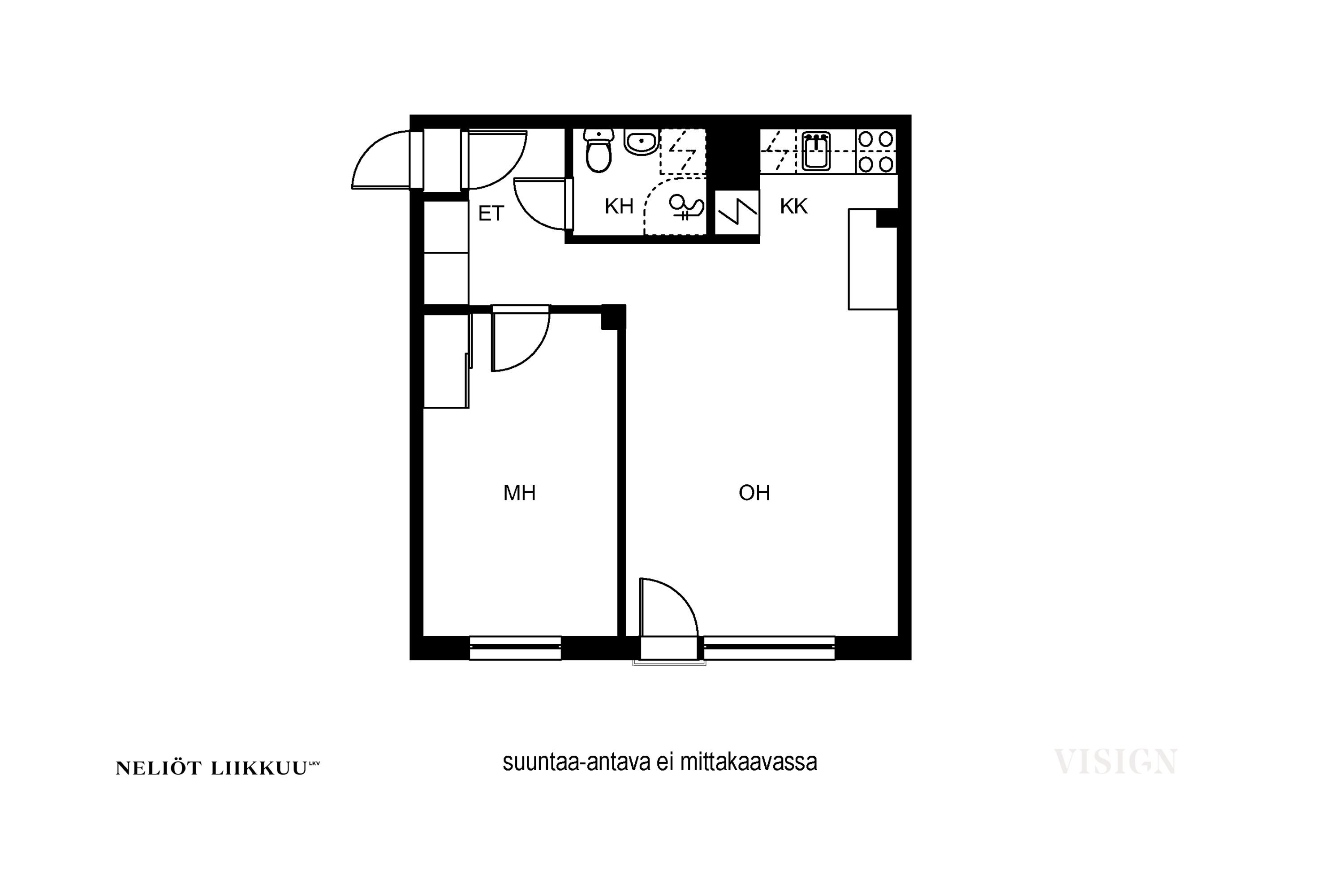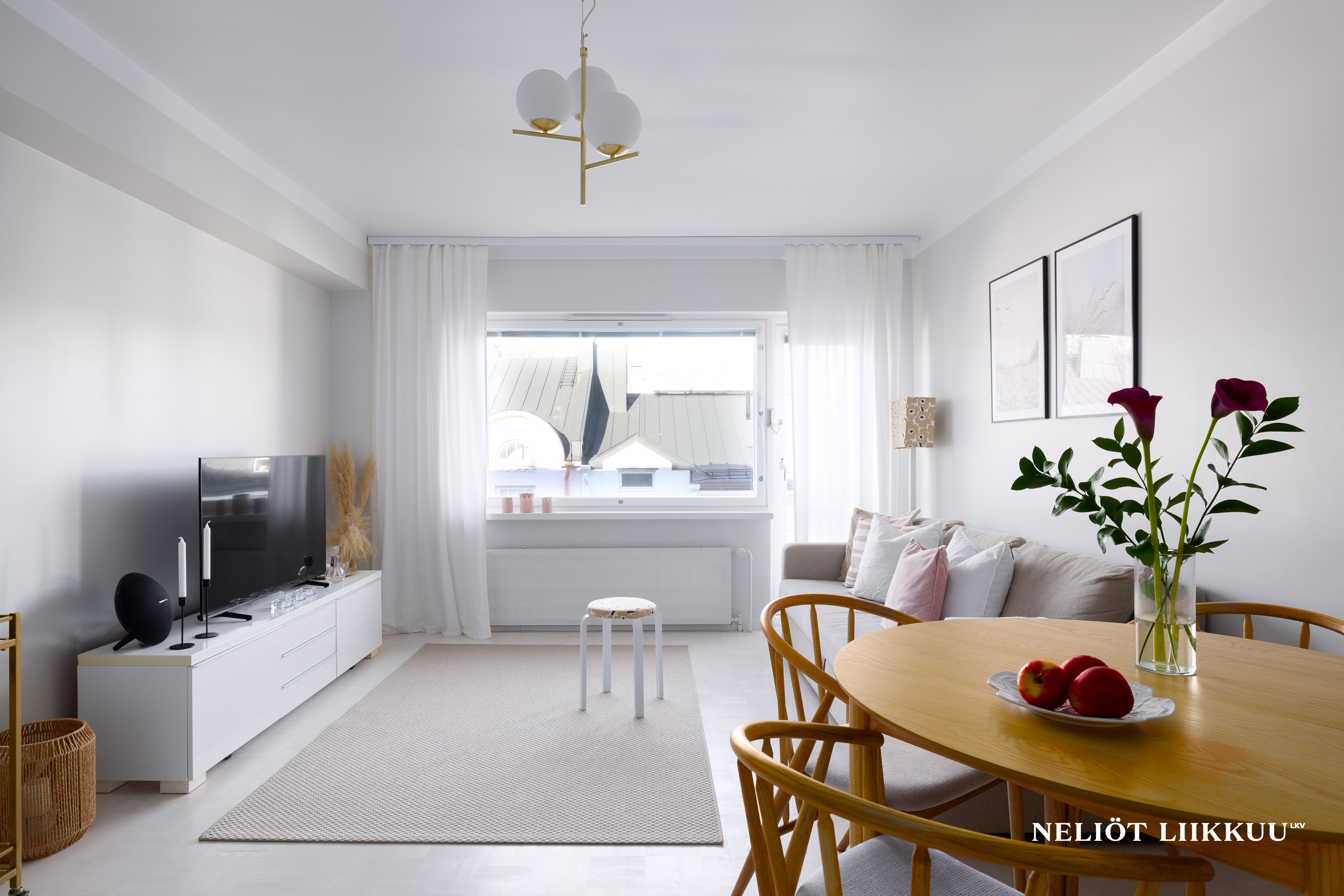 Tämä koti on remontoitu äskettäin neutraaleilla materiaalivalinnoilla ja huoneiston pohjaratkaisu sopii moneen eri elämänvaiheeseen (esim. pariskunnalle tai yksin asuvalle).