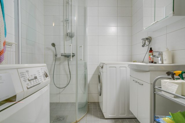 - WC-istuin, suihku, suihkuseinä, ja pesukoneliitäntä