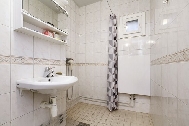- Suihku, lattialämmitys, pesukoneliitäntä, pesuallas, ja peilikaappi