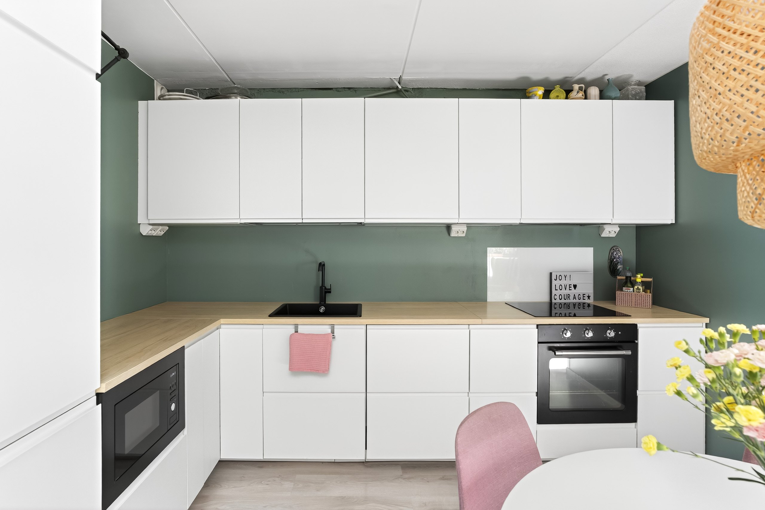 Asunnon avokeittiö on uusittu vuonna 2020 vaalein kaapistoin. Tyylikkäässä keittiössä on integroidut kodinkoneet sekä runsaasti kaappi- ja työtasotilaa säilytykseen ja kokkailuun. Väljä tila on yhtenäinen kokonaisuus olohuoneen kanssa. Keittiön viereinen ruokailutila on muunnettu käytännölliseksi alkoviksi, joka soveltuu tarvittaessa myös esimerkiksi työtilaksi.