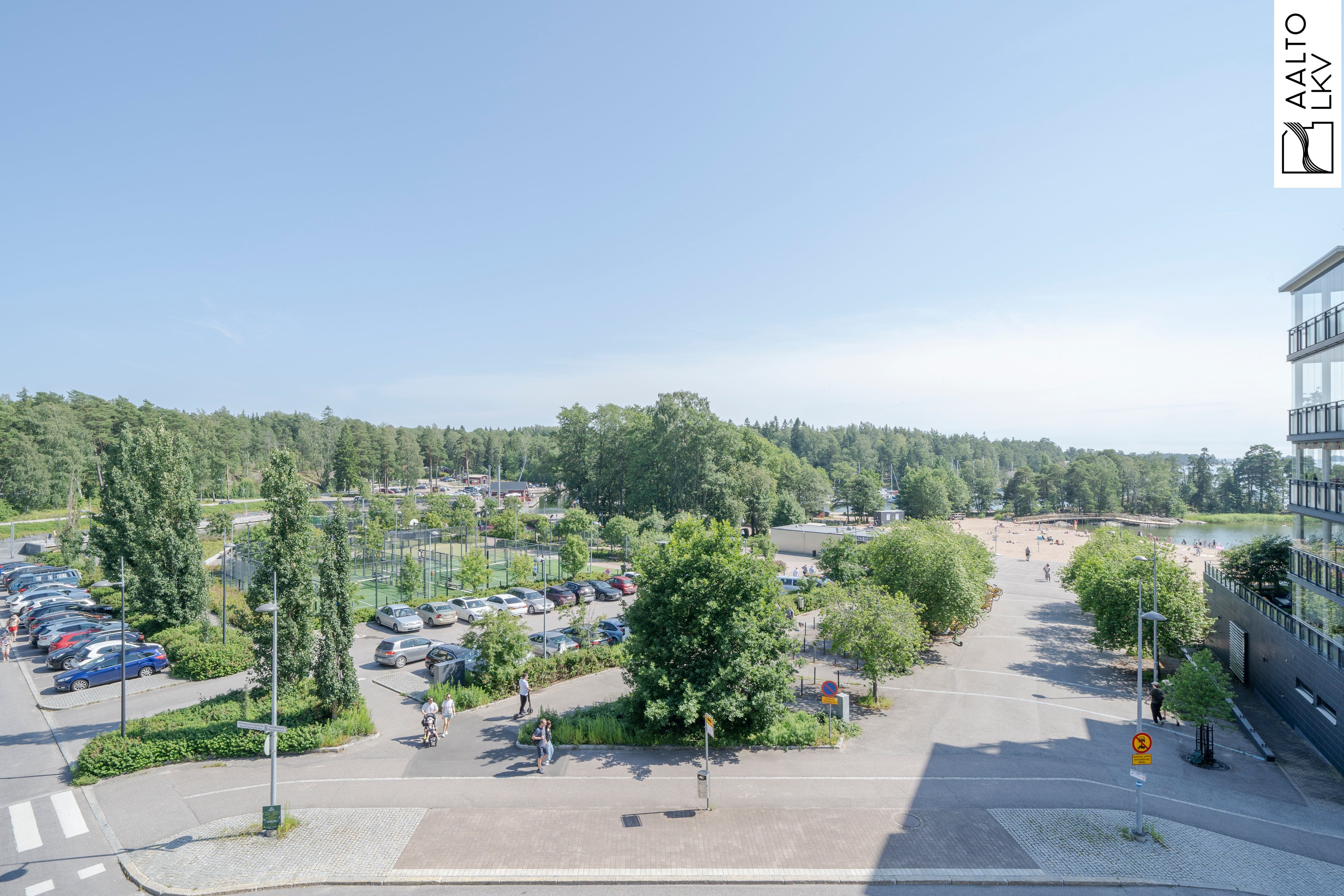 Valoisa ja avara kulma-asunto, josta näkymät Aurinkolahden uimarannalle ja Uutelan kanavalle.
