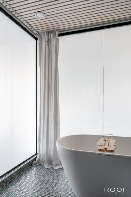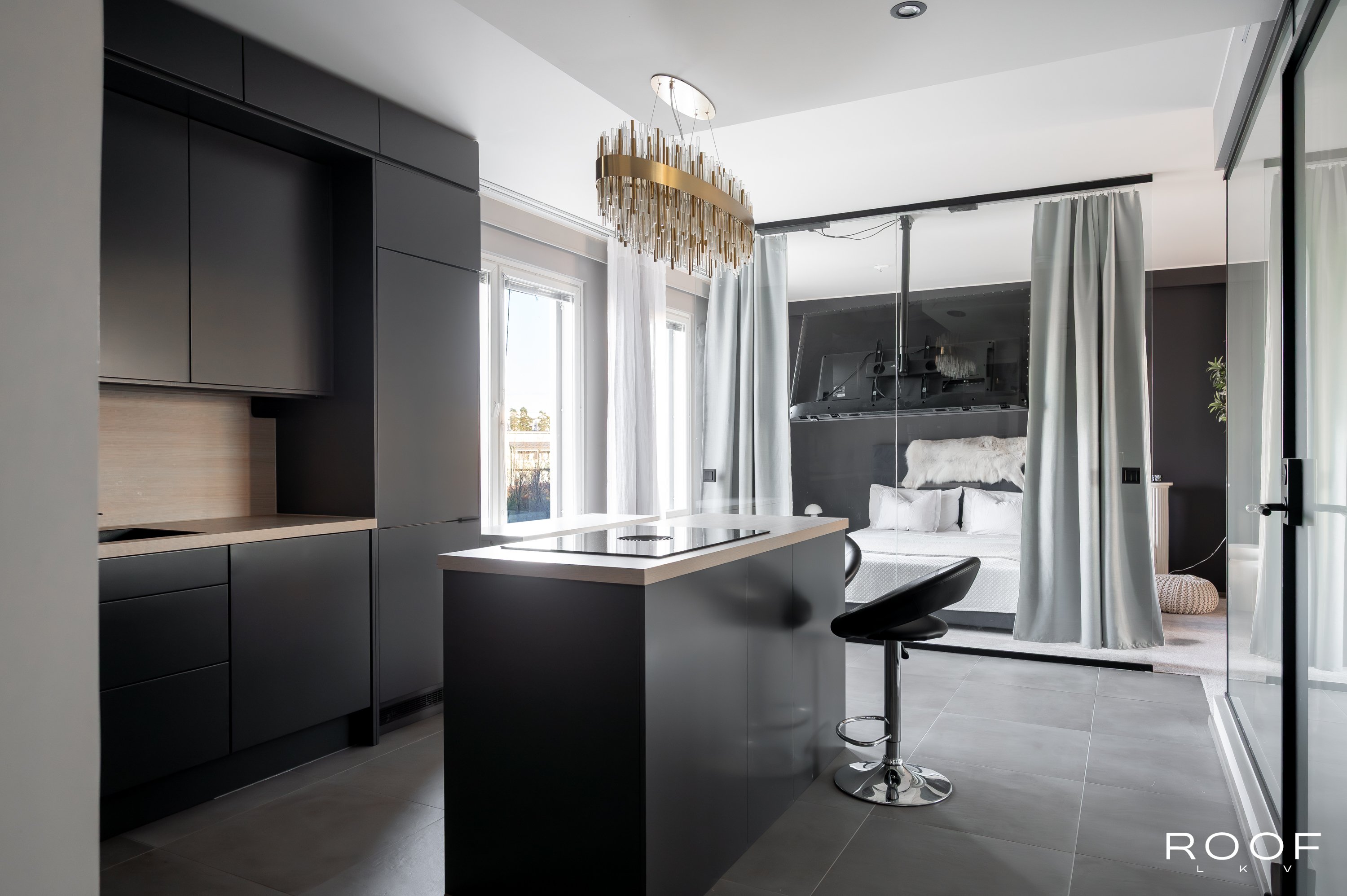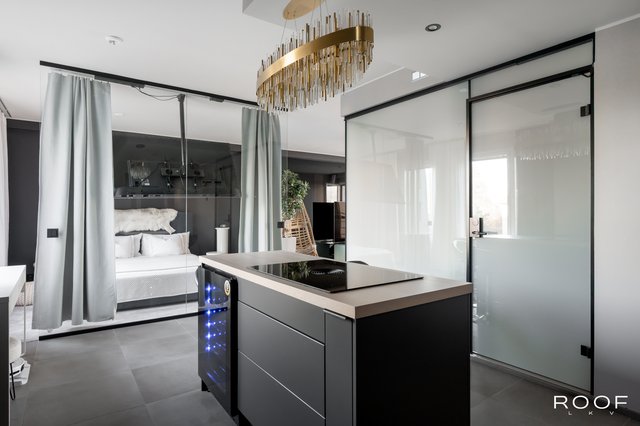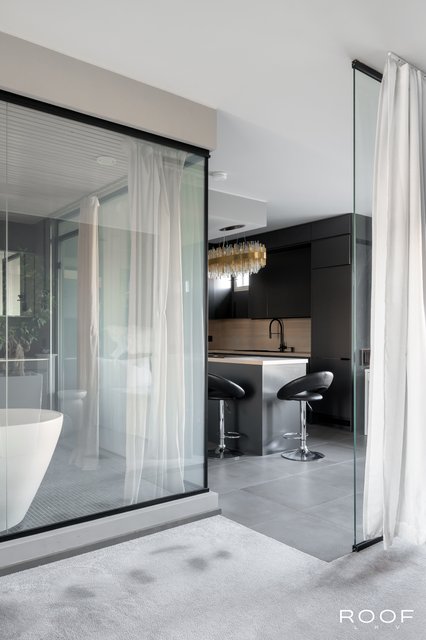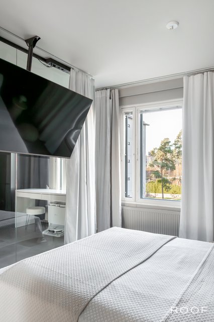 Makuuhuoneessa näyttävä lasiseinä tuo tilaan ilmavuutta ja modernia ilmettä, ja siihen voi kätevästi kiinnittää television. Olohuone jatkaa samaa linjakasta ilmettä lasiseinineen, ja makuuhuoneen sekä olohuoneen yhtenäinen, pehmeä kokolattiamatto viimeistelee harmonisen ja hotellimaisen tunnelman.