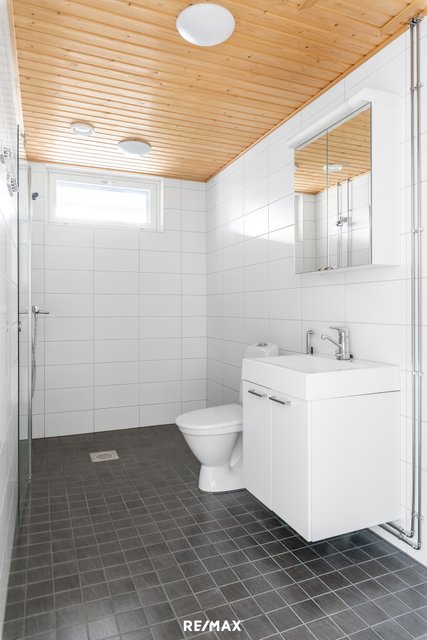 - WC-istuin, suihku, pesukoneliitäntä, suihkuseinä, lattialämmitys, bidee-suihku, pesuallas, allaskaappi, ja peilikaappi