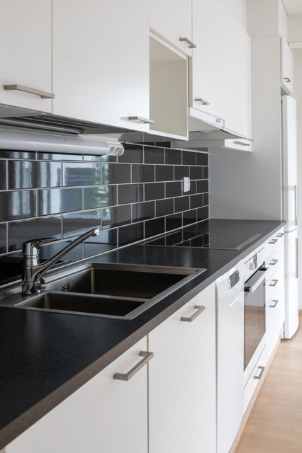 - Jääkaappipakastin, liesi, liesituuletin, uuni, ja astianpesukone