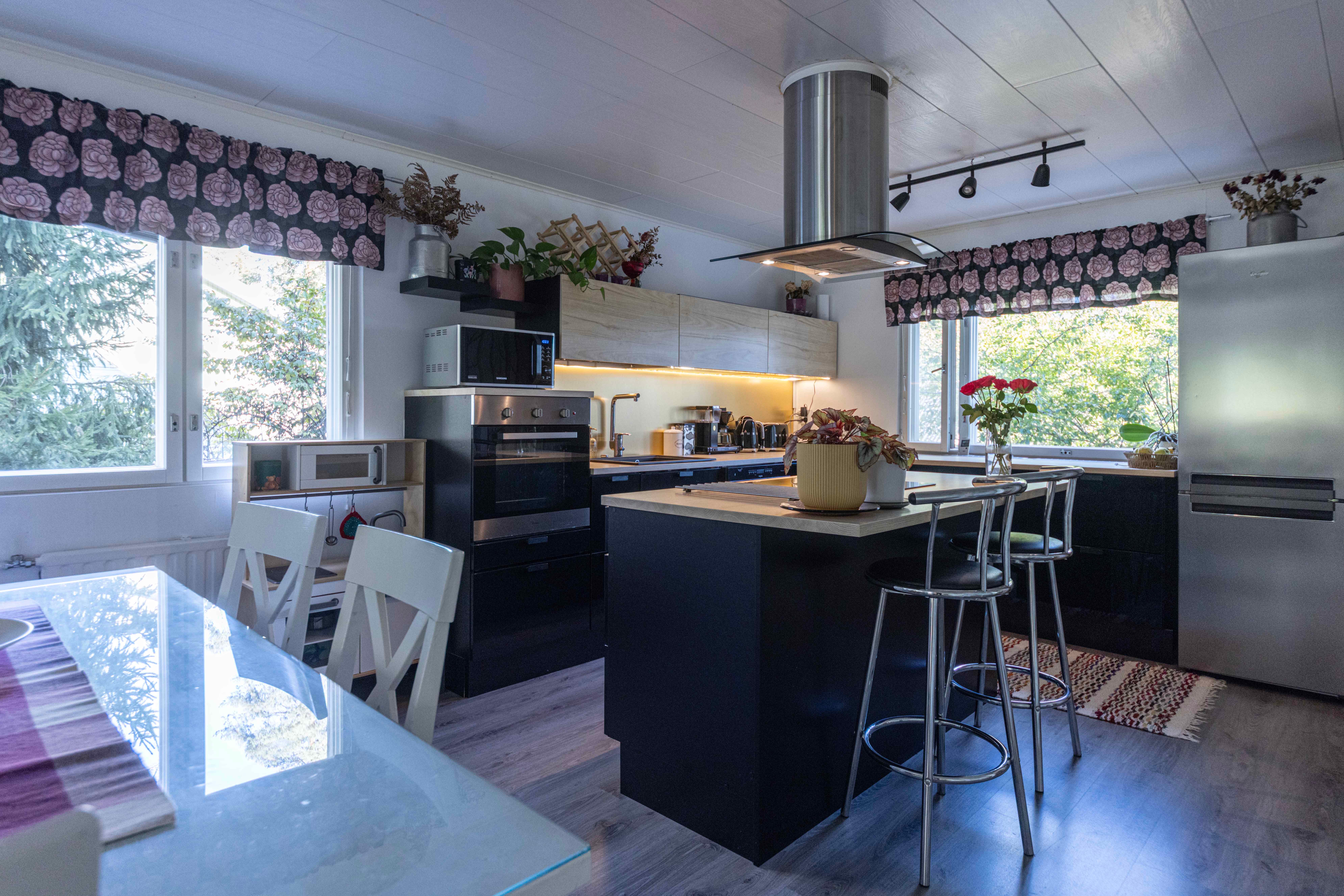 - Valoisa ja toimiva keittiö jossa runsaasti säilytystilaa. Saarekkeessa induktioliesi sekä liesituulettimen huuva.