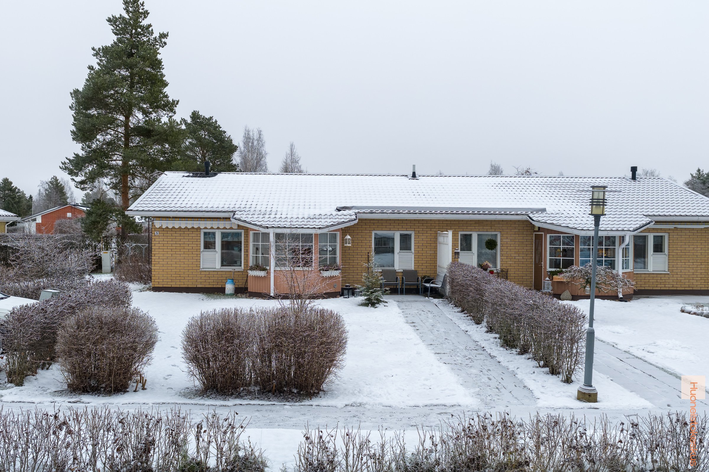 Sisääntulo on lasikuistin kautta. Olohuoneesta on käynti omalle suojaisalle takapihalle. Yhteinen robottiruohonleikkuri naapuriasunnon kanssa helpottaa pihanhoitoa.