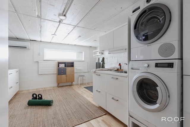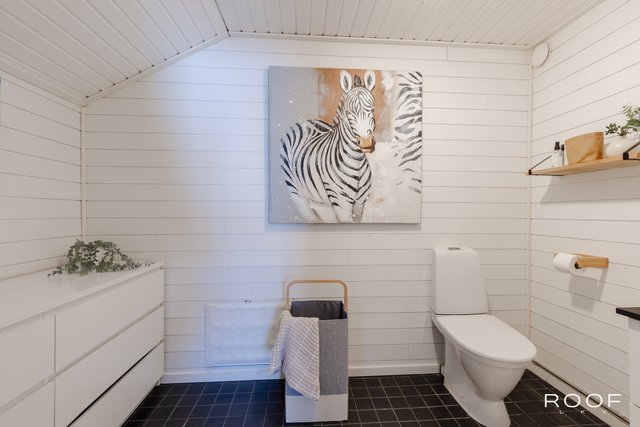 Molemmissa kerroksissa on oma vessansa ja kellarikerrokseen on remontoitu hulppea kodinhoitotila. Täällä pysyy pyykkihuolto aisoissa. Säilytystilat on mietitty ison perheen tarpeisiin, on vaatehuonetta ja lisäksi jokaisessa makuuhuoneessa ja aulassa on kaapistoja.
