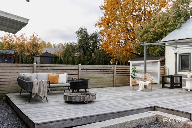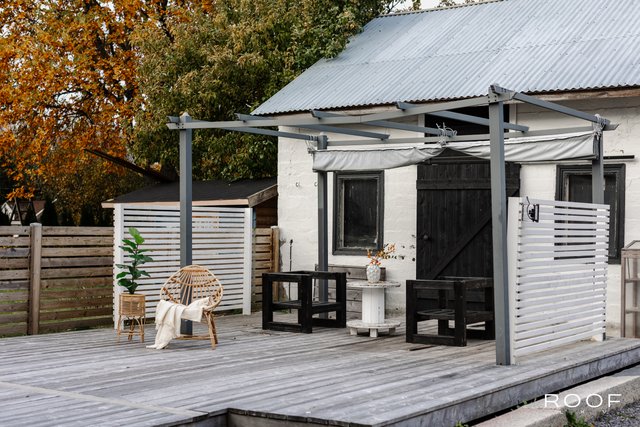 - Terassin pergolan katoskankaan, mikron ja kesäkeittiön ruokapöydän sekä tuolit saa jos haluaa. Ruokapöytä on Länsiporin ulkoilualueen vanhat pitkospuut, jotka käsitelty ja rakennettu ruokapöydäksi. Polttopuut kuuluvat kauppaan