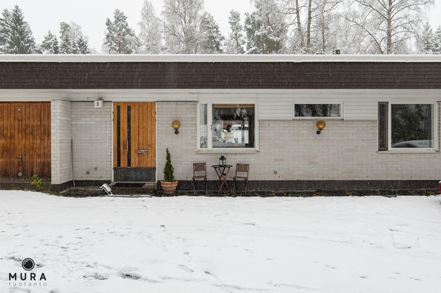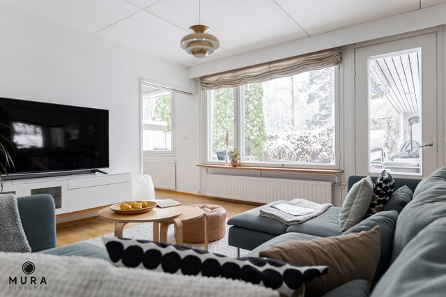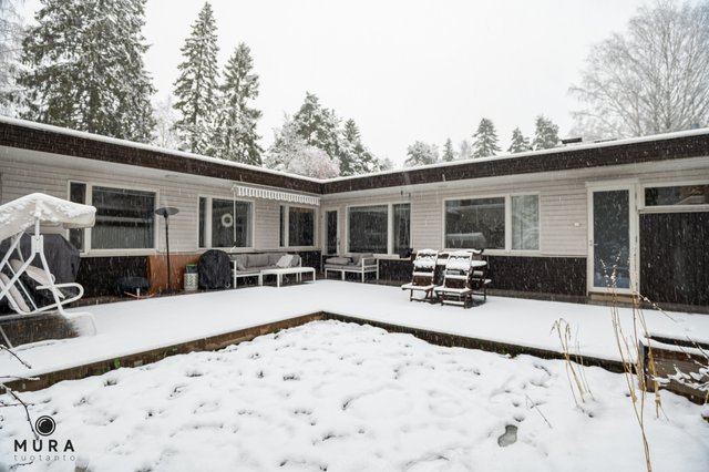 Monella tapaa sisustettavaan olohuoneeseen tulvii ikkunoista valoa, ja sen jatkeena on idyllinen takkahuone. Takkahuoneesta on kulku muutama vuosi sitten täysin remontoituun kylpyhuoneeseen sekä puukiukaalla varustettuun saunaan, jossa löylyt ovat parhaimmillaan. Sekä olohuoneesta että kylpyhuoneesta on kulku kauniille omalle atrium-pihalle josta löytyy monenmoista istutusta, sekä suuri L-mallinen terassi jossa on mukava viettää aikaa.