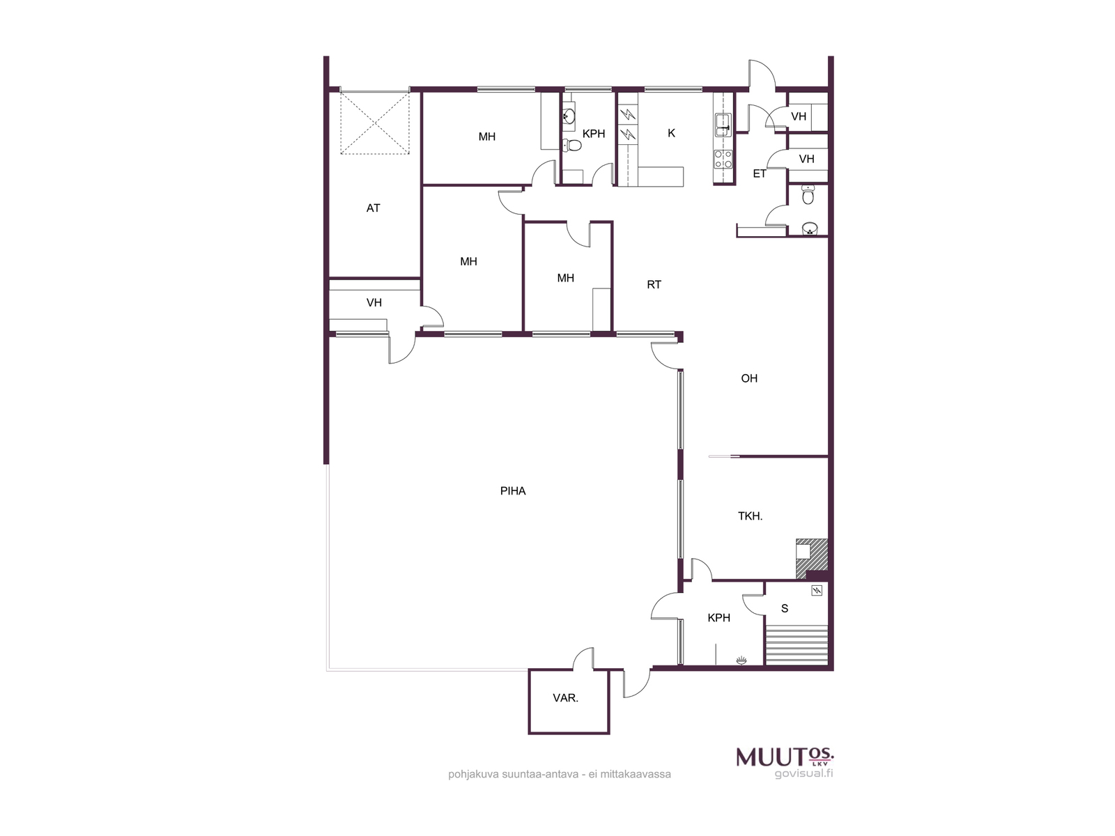 - Pinta-ala ei ole tarkistusmitattu. Hinta ei ole pinta-alaperusteinen. Huoneiston pinta-ala on yhtiöjärjestyksen, isännöitsijäntodistuksen ja myyjän ilmoituksen mukaan 129 m2. Edellä mainittu pinta-ala saattaa tämän ikäisessä kohteessa poiketa olennaisestikin huoneiston nykyisen ja rakentamisaikaisen mittaustapojen ja standardien mukaan laskettavasta pinta-alasta. Huoneiston todellinen pinta-ala voi olla yhtiöjärjestyksessä, isännöitsijäntodistuksessa ja esitteessä mainittua pienempi tai suurempi. Yhtiöjärjestyksen mukaan huoneistoselitelmä: "5h+k+autot+sauna+talouskomero", myynnissä ja markkinoinnissa käytetty selitelmää "4h, k, kph, s, erill.wc, khh/wc, takkah, 3vh, at, var.".