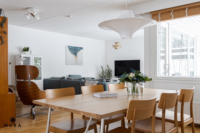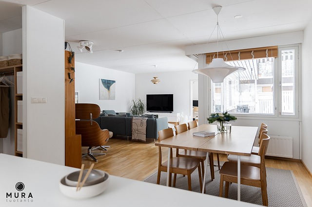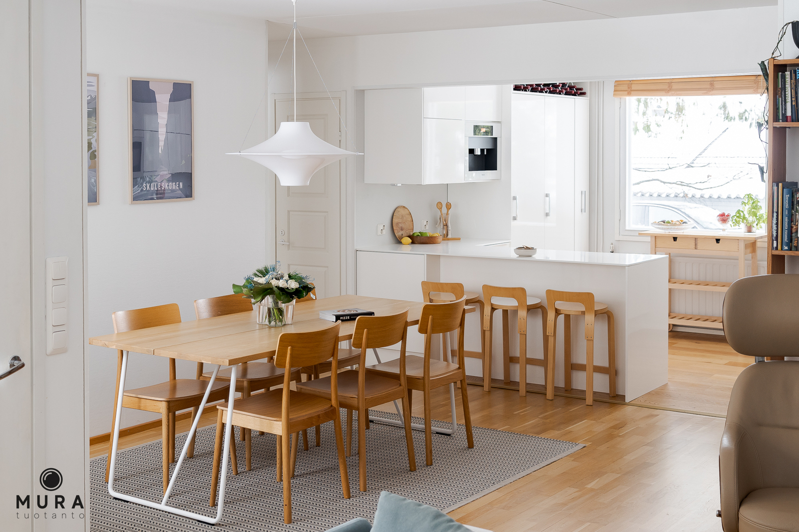 Valoisa, runsaan kokoinen ruokatila on yhdistettynä keittiöön sekä olohuoneeseen sopivan modernisti.