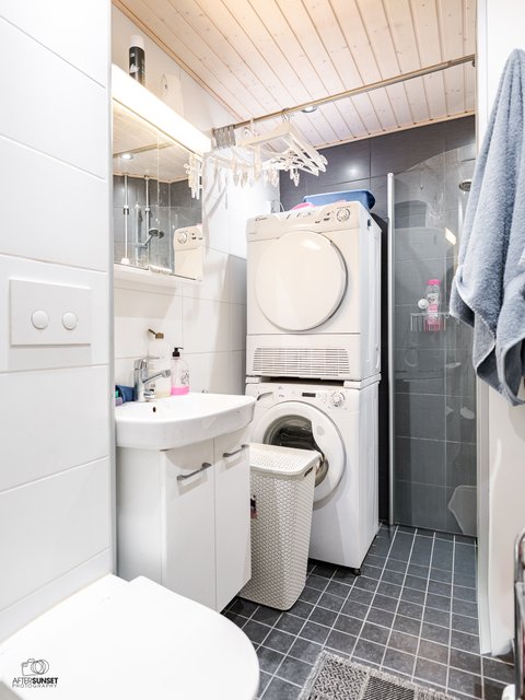 - Suihku, wc-istuin, peilikaappi, kiinteät valaisimet, kylpyhuonekaapisto, ja pesukoneliitäntä